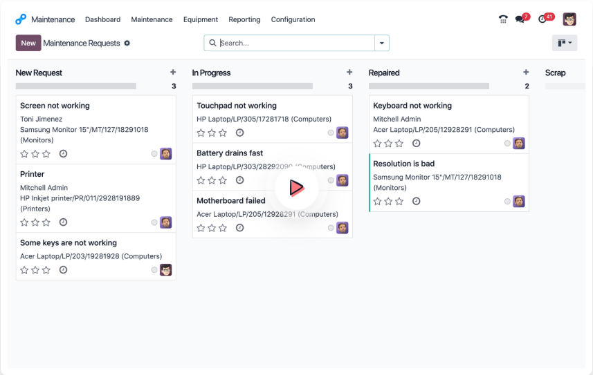 The manufacturing department can trigger maintenance requests directly from their work center control panel. When your maintenance team acts, the right people will be updated in real time.