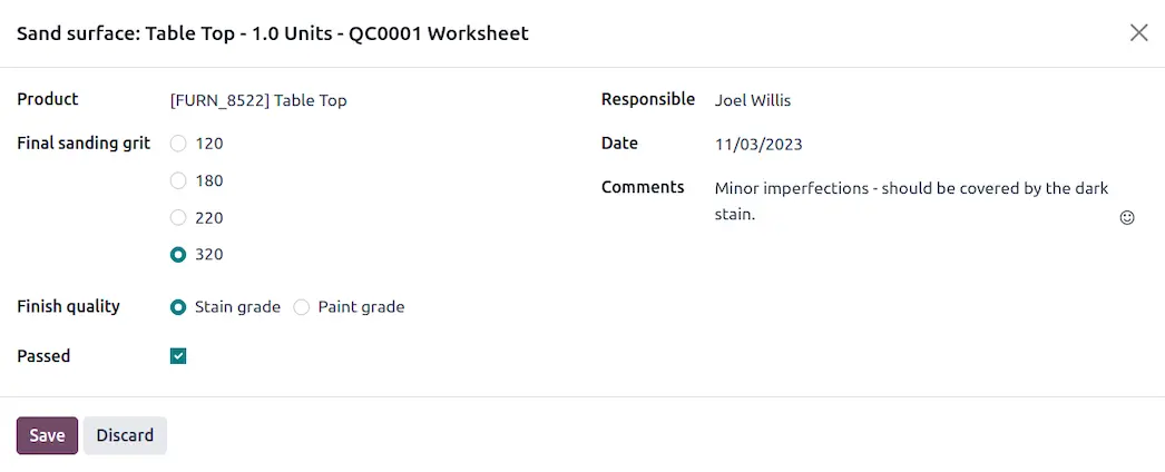 Complete quality checks directly from manufacturing or inventory orders, without opening the Quality app.
